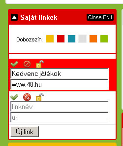 Itt a Linknév-vel jelzett dobozba beleírod a saját linked nevét pl. Kedvenc játékok, utána az URL-lel jelölt mezőbe a webcímet, pl: www.48.hu (elég így). Amíg a zöld pipa jelre rá nem kattintasz, addig kiemelten jelöli a még el nem fogadott lineket: